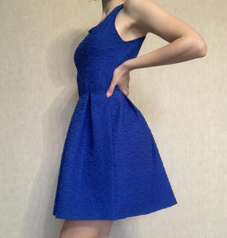 Платье из жатой ткани, насыщенного синего цвета, в отличном состоянии, змейка на спине. Размер подойдёт на М. На фото рост 172.