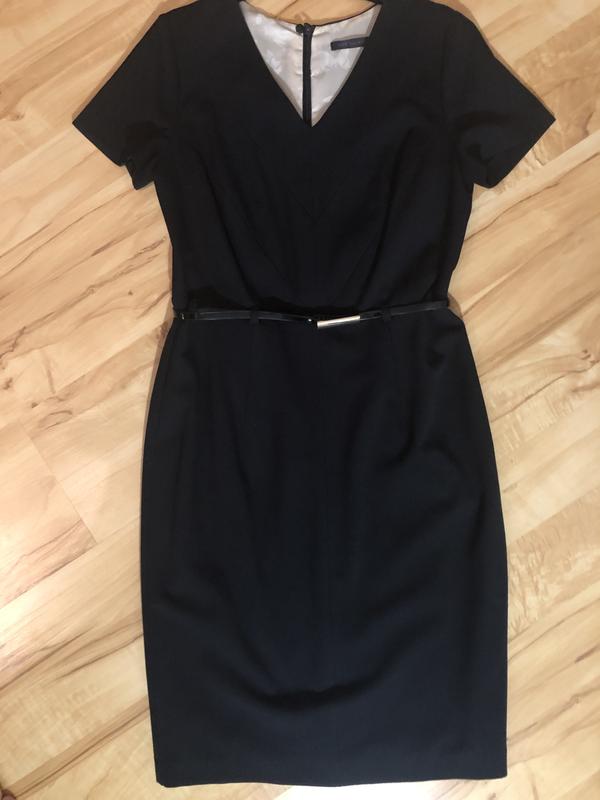 Сукня офісне чорного кольору, трикотаж, на підкладці, по спинці на високій «блискавки», за рахунок чого чудово сідає по фігурі. Цікавий крій, в комплекті тонкий лаковий пояс з пряжкою золотистого кольору. Сукня абсолютно нове, але етикетки зрізані. Підійде на високий зріст. Заміри за запитом.
