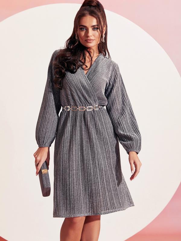 Вечернее платье с нитью люрекс. Модель с фиксированным запахом по груди и эластичной деталью по талии. Манжет рукава на резинке. Без поясу в комплекті.
