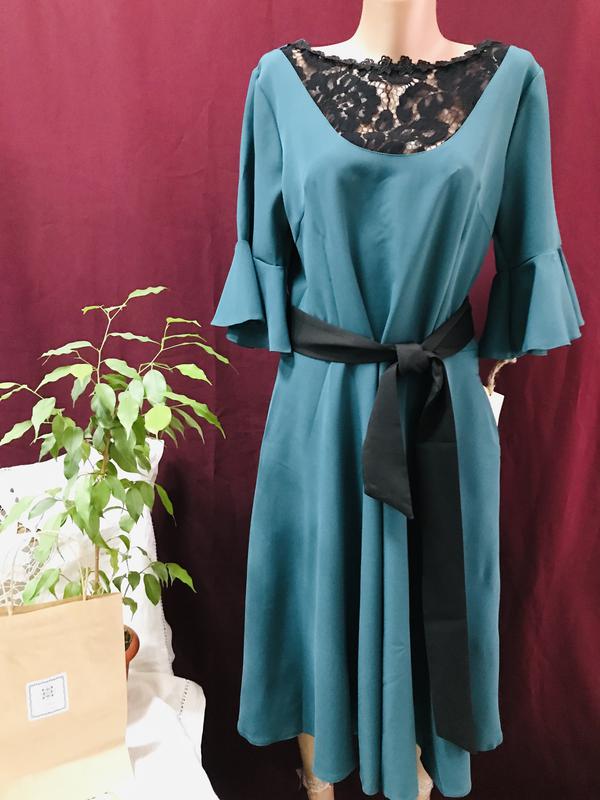 Неймовірна сукня з контрастним мереживним верхом і атласними поясом. Пишна спідниця, рукав з воланом 3/4, на спинці блискавка. Важка спадаючи тканина. В реалі дуже крута! Є розмір 52 та 56