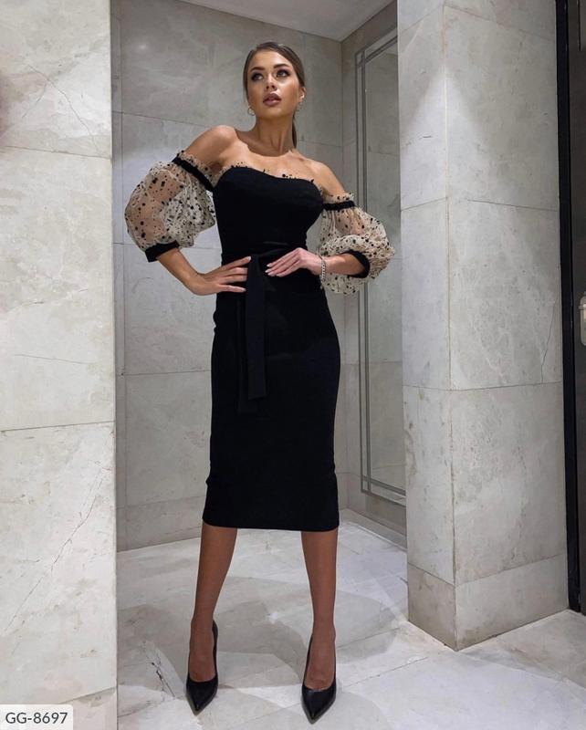 Стильное платье миди. Размеры:42-44,46-48. Ткань:креп-дайвинг+сетка горох. Цвет:черный. 11.12.ОЩ