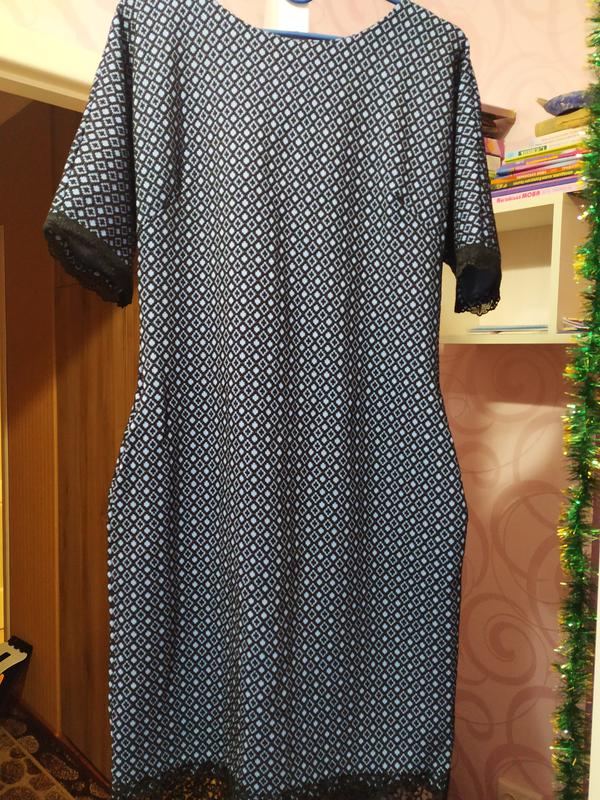 Гарної якості, колір чорний з голубим, на рукавах і знизу ажурне, тканина не мнеться, приталенне, з карманами, пише розмір Л, буде на 44-48