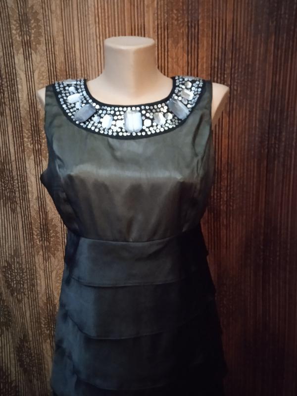 Платье от next черного цвета с завышенной талией, лиф платья из черной органзы на бежевой атласной подкладке, низ выполнен из многоярусных атласных оборок настроченных на подкладку, на спинке молния, красивое украшение горловины. длина миди. Размер: UK 12 Состав: полиэстер, подкладка полиэстер. Замеры: Пог 50 см, Под грудью 39 см, Длина спинки платья 93 см. Состояние идеальное.
