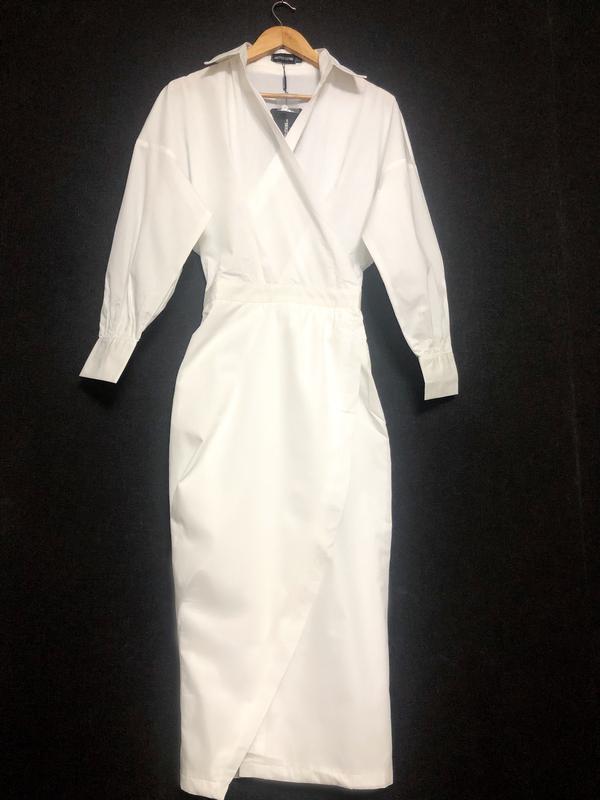Получите эффектный образ с этим платьем-рубашкой. Из белой ткани с запахом. Классное сочетание с прозрачными каблуками и мини-сумкой для простого, но шикарного образа. Внизу там где начинается юбка у платья идёт подкладка чтобы не просвечивалось