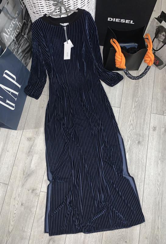 ECO Italy Итальянский бренд одежды Красивое вечернее платье Ткань выполнена из тонких вертикальных полос Глубокий синий цвет{бархат} и темно-синий шифон По бокам разрезы Без застежек и молний Рукав 3/4 на тонкой резинке Размер it 46{L/XL} Но его можно носить и в размере М , в более свободном варианте , с тонким поясом или же просто как легкий оверсайз Сверяйтесь по замерам Расстояние между подмышками-51/53 Поб-57 Длина-139
