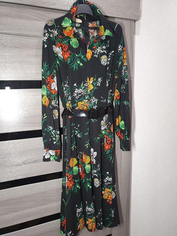 Платье в очень красивый принт,сзади от пояса идёт молния,плечи41см,пог 50смрукав 75см,талия 45см,длина 115см,бедра свободно ,р-р16.Ткань тянется ,100% вискоза