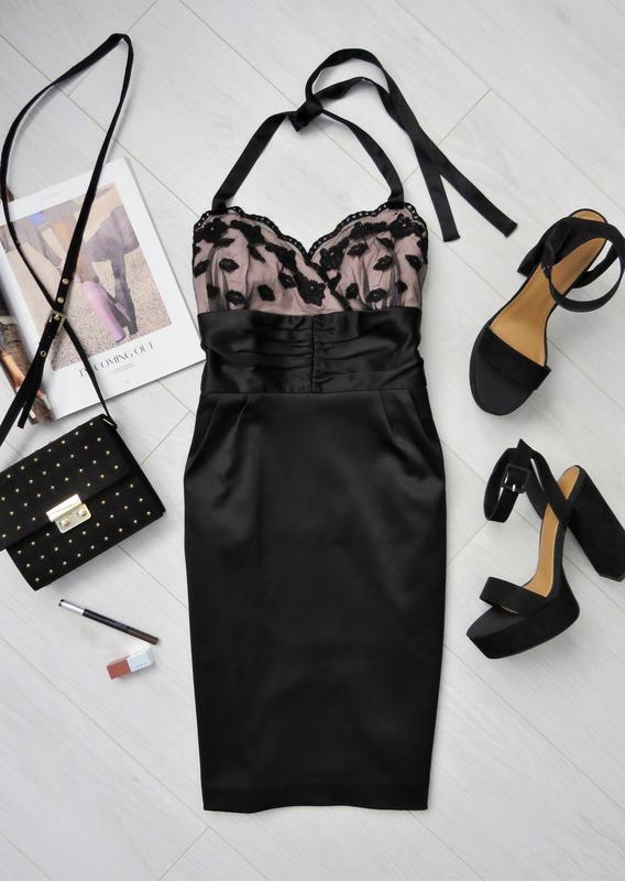 Вечернее платье с завязками на шее. Талия слегка завышена, спинка открыта до лопаток. Застегивается сбоку на скрытую молнию, на подкладке. Ткань по типу атласа. Замеры: полу обхват груди 47 см, полу обхват талии 39 см, полу обхват бедер 51 см, длина от верхнего края лифа без учета бретельки 78 см. Состав: 97% полиэстер, 3% эластан; подкладка 100% полиэстер; кружево 100% коттон