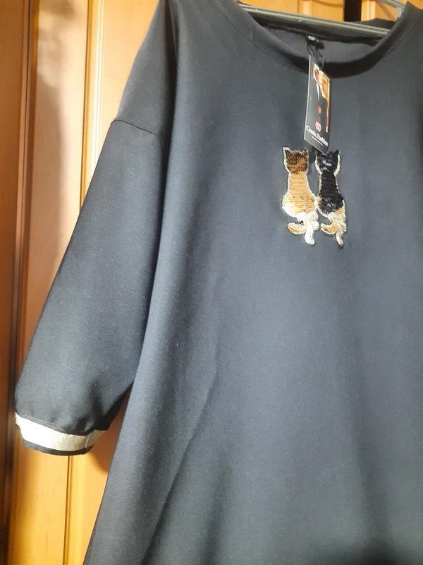 Длина 120 см ПОГ 69-70+см. ПОБедра 71см(без натяжения) Рукав спущенный ,до запястья(длина от горловины 58см) Коты из пайеток и могут менять цвет-золото на черный и черный на золото.Но украшение ненавязчивое Цвет угольно-черный Фасон свободный прямой Декольте умеренное По низу рукава-лампас-манжет-золото ОООчень стройнит и универсальное-и на пир и в мир. Состав:90 % вискон 10% эластан-плотная тянется по фигуре ткань .демисезон