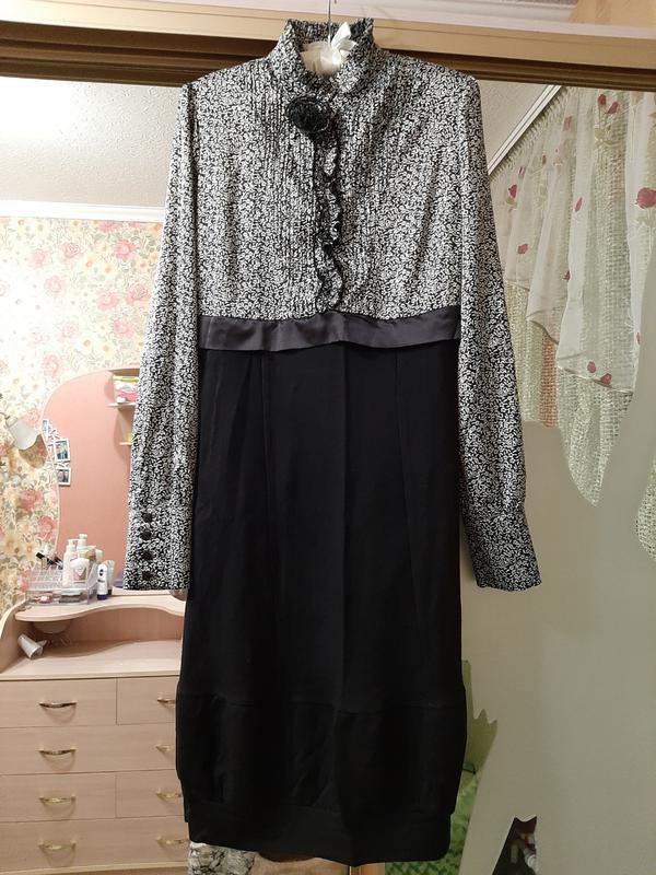 в идеальном состоянии платье, имитация юбки и блузки. блузка шёлковая, юбка плотный трикотаж. воротник стойка с рюшем. рукав вверху присобран, внизу широкий манжет. спереди застёжка с зигзагообразно пришитым рюшем. талия чуть завышена. юбка внизу присобрана манжетом. сбоку потайная молния. шикарное, стильное, нарядное и повседневное. замеры: плечи 36, подмышки 49, талия 39, длина рукава от плеча 63( должен быть напуск), длина от плеча 97, до талии 36, бедра 48. пишите. спрашивайте. оплата на карту. без возврата. смотрите другие мои лоты. много кожаной обуви и сумок. одежды для детей и взрослых. дублёнки.