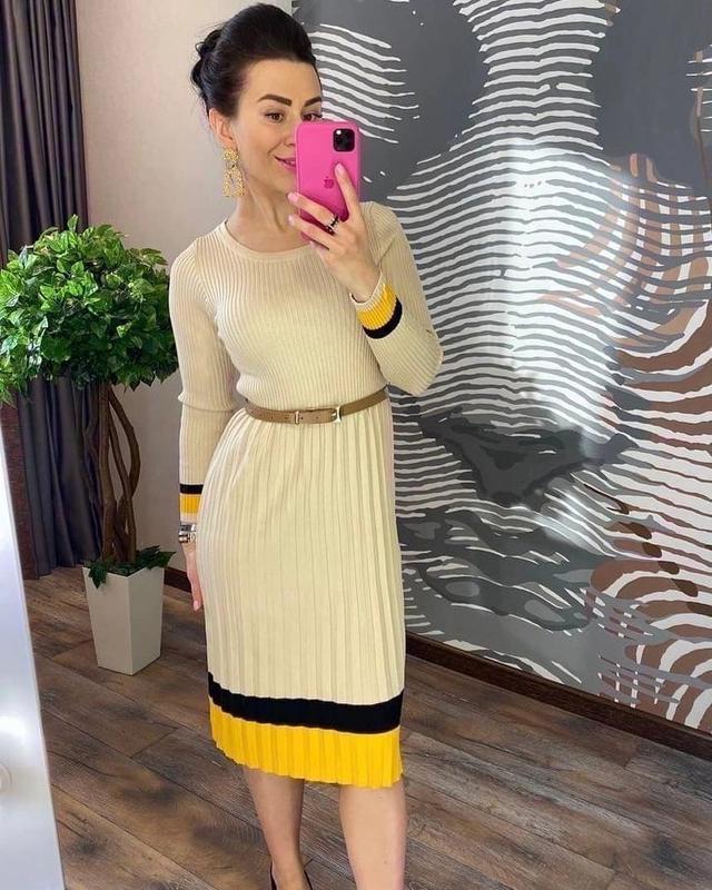 🧡НОВИНКА СЕЗОНА ТОВАР КЛАССА ЛЮКС 👍👍👍 очаровательное платье приталенного кроя в комплекте с поясом ,смотрится стильно и дорого, изготовлено из высококачественного трикотажа машинной вязки в верхней части и на рукавах выполнено в виде резинки, в нижней части юбка - гофре свободного силуэта платье шикарно выглядит благодаря безупречной посадке и яркому декору из черно- желтых полос РАЗМЕР УНИВЕРСАЛЬНЫЙ 42-44 КОД 04 🍃 ЦЕНА 6⃣8⃣0⃣ ГРН
