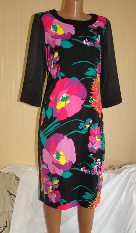 Платье Teatro Нарядное, с цветочным принтом. На подкладке. Состав 97 % полиэстер, 3% эластан. Полуприталенного силуэта. Рукав три четверти, застежка по спинке на потайной молнии длиной 55 см. По низу платья шлица. Размер 50 (L, UK 14). Ширина по груди 51 см, по талии 42 см, по бедрам 52 см. Ширина по плечу 10,5 см. Длина рукава 44см, ширина рукава по низу 14 см. Длина от плеча до низа 104 см. Цена 660 грн.