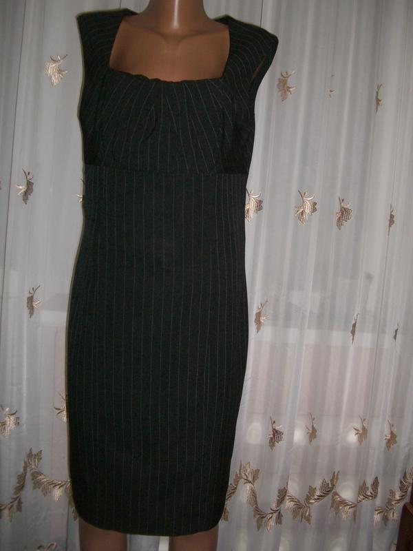 Строгое офисное платье-сарафан черного цвета в полосочку на подкладе с круглой горловиной в складки по верху, без рукавов, юбка-карандаш со шлицей сзади, можно носить под поясок, красиво смотрится под гольфик или тоненький гладкий свитерок. ПОГ 45см, ПОТ 41см, ПОБ 47см, плечо 10см, длина 101см.