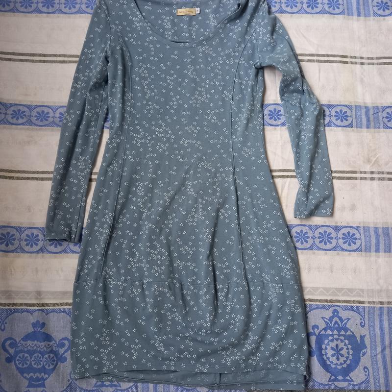 Очень милое платье,размер 44-46-48 ткань натуральная,серо-голубого цвета,милый белый цветок.Плечи 42-44, ог 52, рукав 62 см, длина 90 см