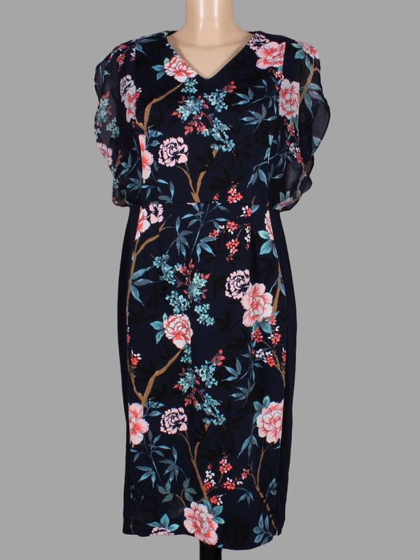 Красивое платье из плотного трикотажа с шифоновым рюшем. Хорошо вытягивает и стройнит за счёт кроя. Женственны принт, благородный цвет. Размер указан 14 Длина 101, пог 50, хорошо тянется, пот 41, поб 54, без проблем потянется до 60-65