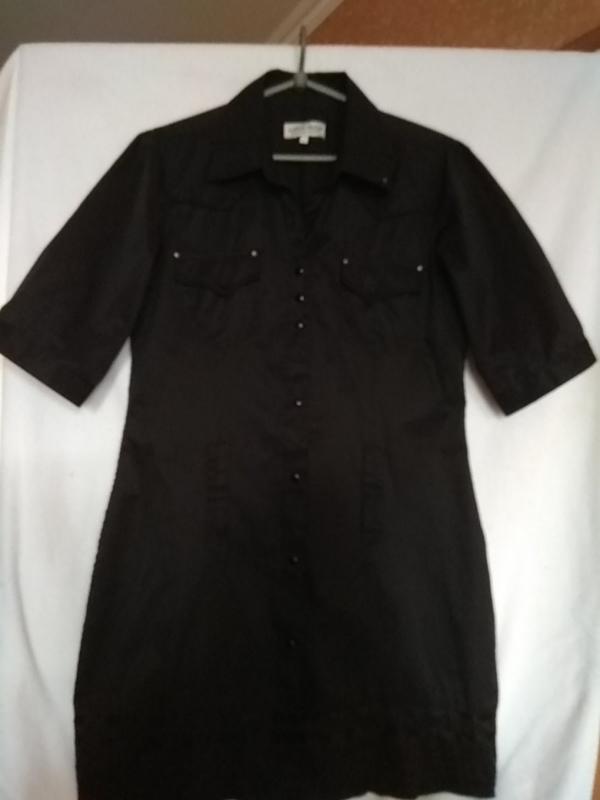 Очень классное чёрное фирменное котоновое платьице спереди на кнопочках с рукавчиком до локтя. На груди маленькие кармашки. Прямое. Лёгкая немнущаяся ткань, приятная к телу. На спинке логотип. ПОГ 49 см, ПОТ 44 см, ПОБ 55 см. Длина рукава от плеча 33 см, в плечах 40 см, длина по спинке 90 см . Смотрится очень стильно. По низу декоративная строчка и атласная тонкая ленточка. Ткань не тянется. Состояние идеальное.