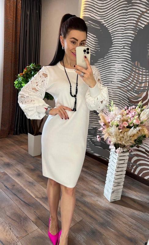 🧡НОВИНКА СЕЗОНА 🍃🍃🍃 сногсшибательно красивое платье прямого кроя с круглым вырезом изготовлено из качественного и приятного к телу трикотажа гладкой машинной вязки , украшенное шикарными объёмными рукавами из очаровательного гипюра с изумительным узором на высоких манжетах РАЗМЕР УНИВЕРСАЛЬНЫЙ 44-48 ДЛИНА ПЛАТЬЯ 96-98 СМ КОД 2102 🍃 ПОЯС ИЗ ЖЕМЧУЖИН +80 ГРН