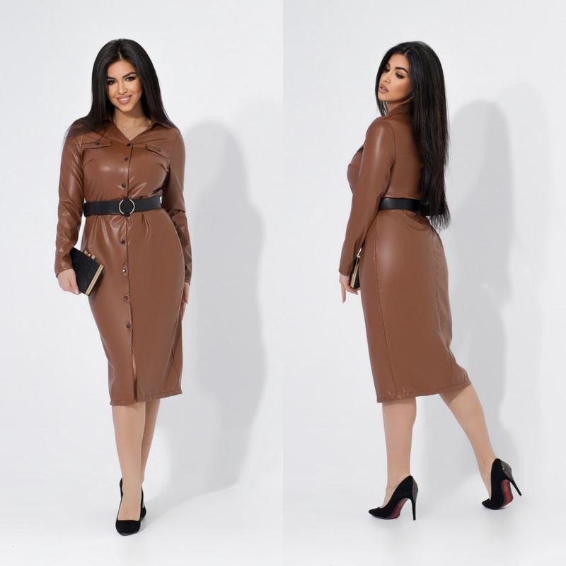 😻Платье арт. bb. 364 Комфортное платье-сафари с отложным воротником и длинными рукавами из эко кожи. Застегивается на кнопки по всей длине, пояс в комплекте. Ткань: эко кожа Размер: 48-50, 52-54, 56-58 Цвета: черный, бутылка, мокко
