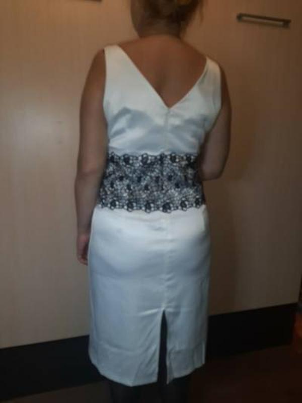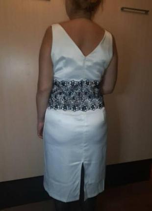 Очень нарядное платье из белого стрейч-атласа с отделкой из вышитого гипюра.За счет плотной стрейчевой ткани,скроются все недостатки фигуры.Одето один раз. Размер50- 52,но смотрите по замерам. ПОГ 54см ПОТ 49см ПОБ 58см ДИ 105см Разрез 27см Молния 37см Есть точно такое же платье,но черное с белым.