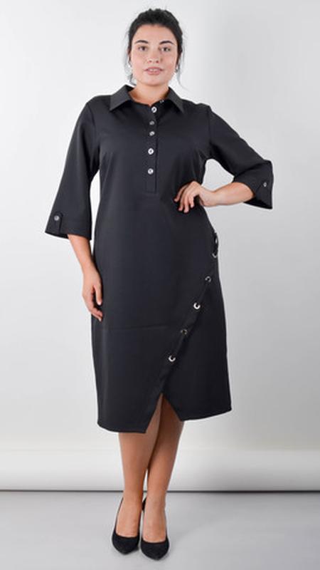 Стильна сукня прилеглого силуету виконана з костюмної тканини, яка відмінно тримає форму та приємна до тіла. Гудзики на передній полочці служать застібкою, низ прикрашений люверсами. По спинці сукнюя прикрашають нашиті гудзики. На рукавах декоративні патики. Матеріал: костюмна тканина Розміри: 50-52, 54-56, 58-60, 62-64 Довжина: 107см (± 3 см), Довжина рукава 42см Зріст моделі: 170 см