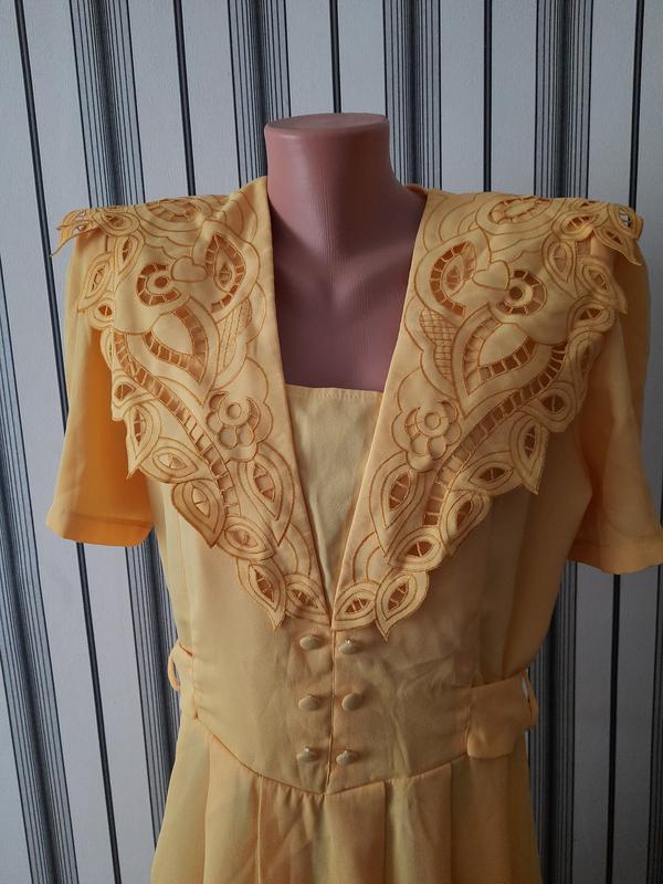 Вінтажне плаття в ідеальному стані. Не носилося зовсім.Комір -вишивка з перфорацією.Дуже якісна цупка тканина,нажаль не знаю назви,.Не мнеться і гарно спадає.
