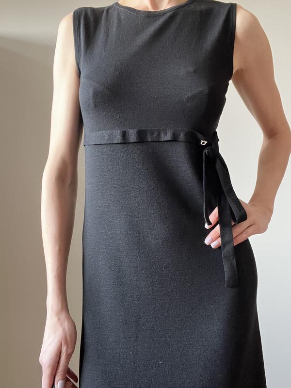 Благородное и элегантное чёрное платье из тонкой шерсти в идеальном состоянии, талия завышена и тонкий ремешок, пришита фирменная брошь значок бренда. Под жакет или пальто очень красиво. ПОГ - 40. ПОТ - 38. Длина от плеча 105 см.