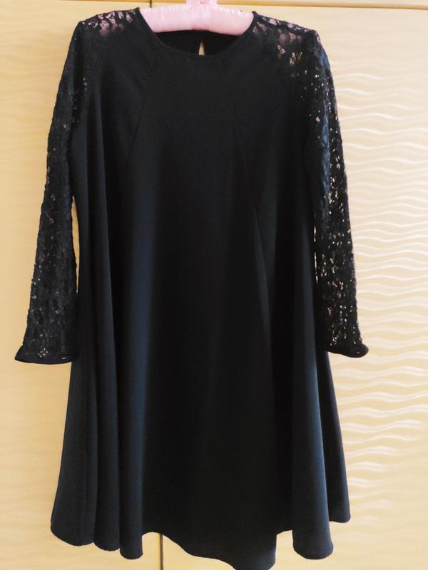 Элегантное чёрное платье с кружевными рукавами. Состав: 52%. нейлон, 48% летящее за счёт расклешенного кроя скрадывает все недостатки фигуры делает вас стройной изысканной. По запросу замеры и дополнительные фото.