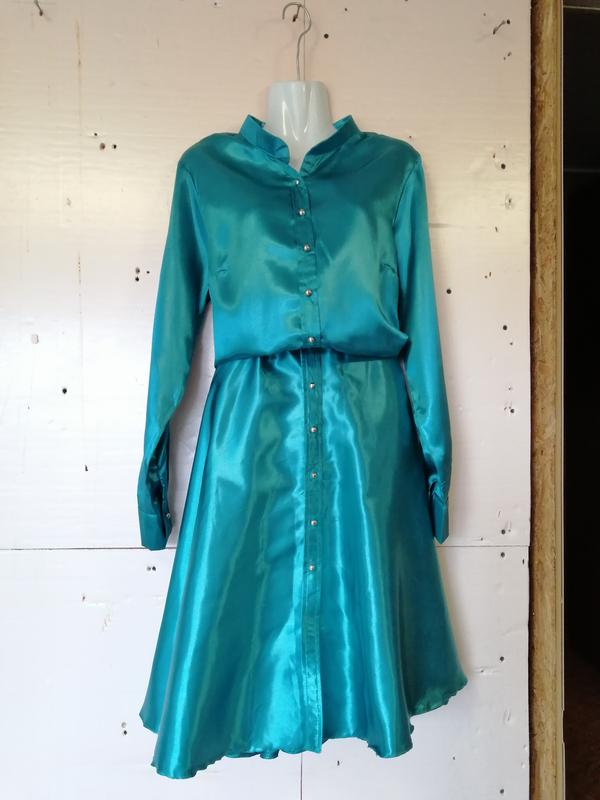 Платье рубашка с золотистыми пуговками отрезная юбка солнце бирок с составом ткани нет ( ткань 100% искусственная) размер 52 **** плечи 43 см пог 56 см пот резинка 38 см тянется на 50 см длинна платья 114 см длинна рукава 65 см ...