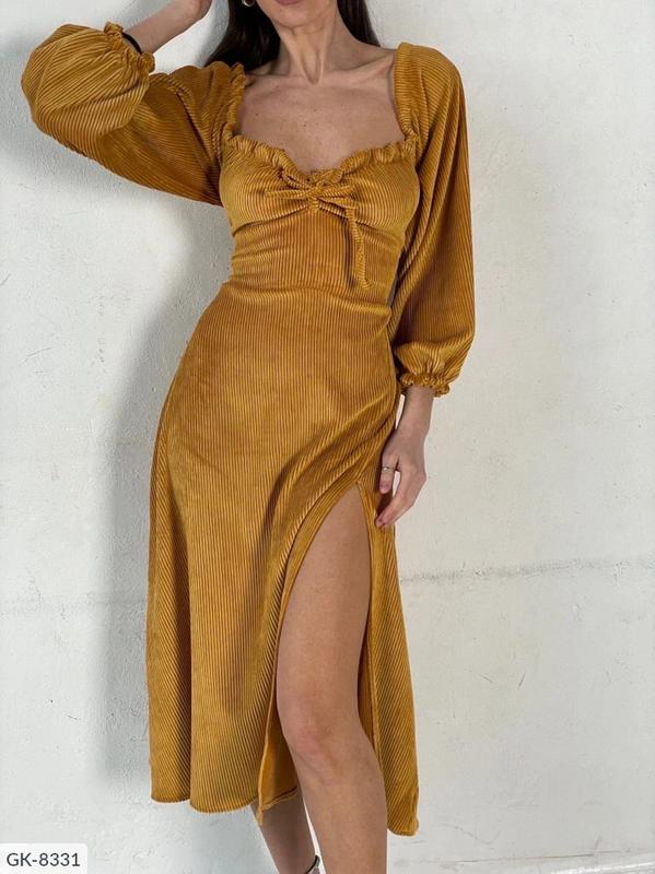 Платье GK-8331 арт 05628 Размеры: 42-46 Материал: вельвет на хлопковой основе. Платье можно моделировать : веревочки, расположенные в районе груди, можно завязать бантиком или сделать вырез декольте более глубоким. Сзади шнуровка - регулирует приталенность. Длина 115 см, замеры: 42-46: ог 80-98, от 55-90, об 80-102 ----------------------------------------