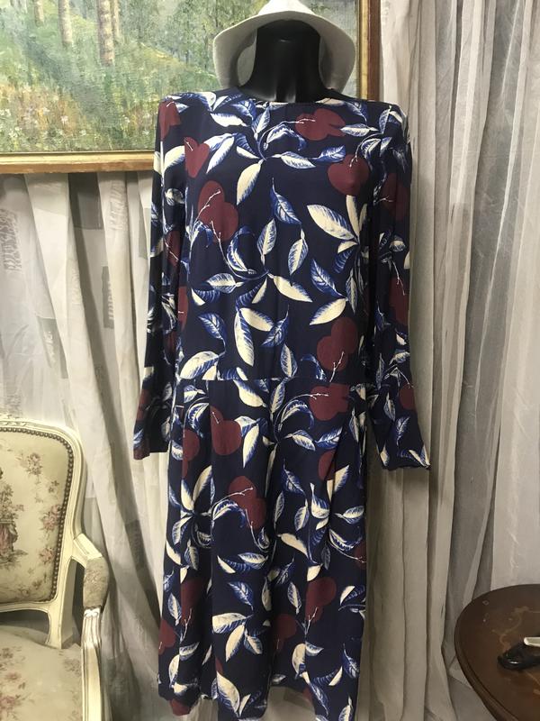 Красивое платье миди из вискозы. Свободный крой, заниженная талия, по две складки с каждой стороны(спереди и сзади), длинный прямой рукав. Красивая расцветка. Состав:вискоза-100/, размер по бирке 😏М. Замеры:длина-108 см, ПОГ-48 см, ПОБ-51 см, рукав-61 см. Есть небольшое загрязнение по краю горловины спереди -нужно застирать.