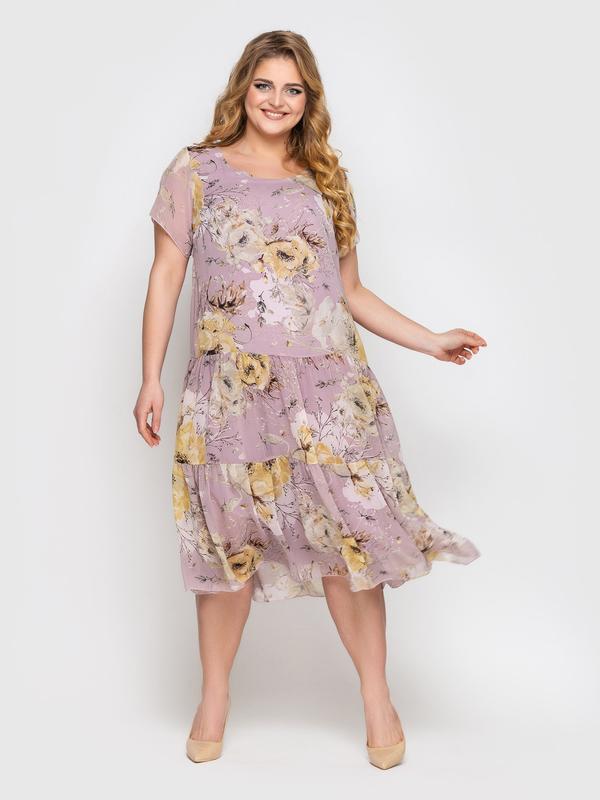 Легкое платье миди из шифона пудрового цвета в принт, большие размеры от 52 до 58