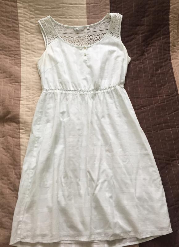 Гарне літнє плаття бренду Tom Tailor. Розмір M-L. На поясі резинка під грудьми. У грудях тягнеться до 100 см. Красива мереживна спинка. Довжина ідеальна. ОГ 46, ОТ 37 ( на резинці) до 44 ОБ 52 Довжина 92. Також підходить вагітним. Не вагітним гарно приховує недоліки в області живота.