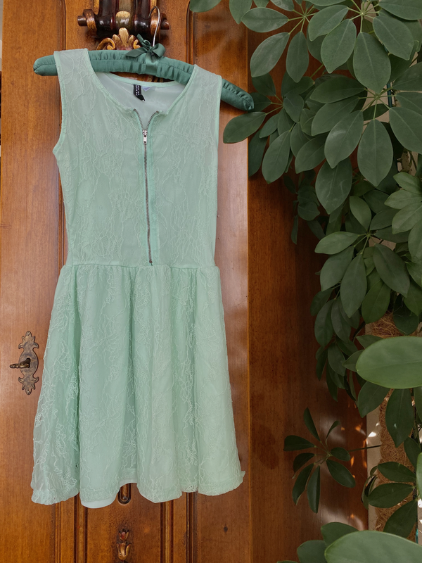Ментоловое платье с декольте на змейке. Кружево и подкладка.