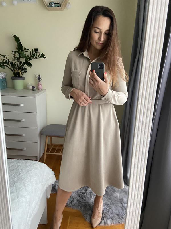 Дуже зручна та приємна до тіла тканина під замш! Верх сукні в сорочковому стилі, спідниця трапеція. Довжина нижче коліна. В комплекті поясок з того ж матеріалу. Більше фото та заміри по запиту.)