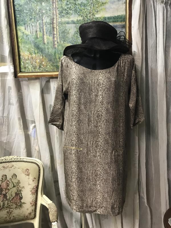 Свободный силуэт, змеиный принт. Платье без подкладки, рукав-до локтя, спереди на линии бёдра декор в виде двух металлических молний(имитация карманов). Состав:шёлк-100/. Шёлк отменного качества. Размер по бирке-М. Замеры: длина-87 см, ПОГ-48 см, ПОБ-49 см.