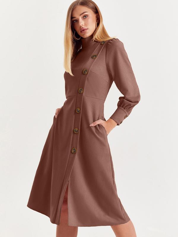 "Замшевое" (ткань) платье с декоративными пуговицами и воротником-стойкой. В боковых швах - карманы. Застегивается на скрытую молнию по спинке. 60% полиэстер, 35% вискоза, 5% эластан цвет - темный беж (коричневый свет) =- фото 1-2 фото 3-4 (запрашивайте — быстро разбирают