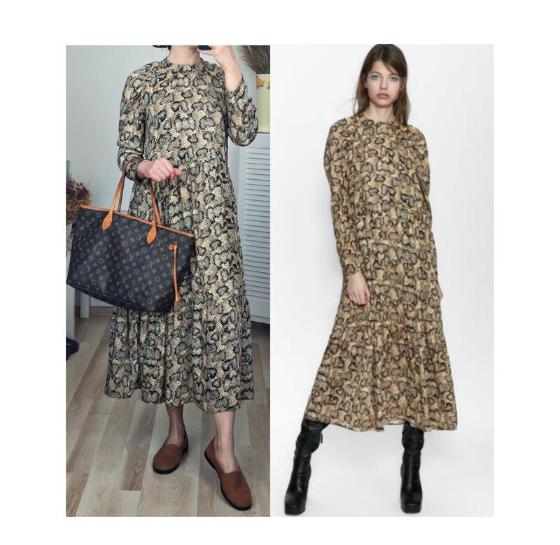 Миди платье zara макси платье змеиное анималистичныйпринт оверсайз платье с объемными рука...