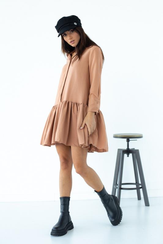 Главной изюминкой, которое обладает это модное платье – это строгий воротник рубашечного стиля и красивая рюша, расположившаяся по подолу. Платье, вдоль планки, застегивается на семь пуговиц, которые прикрыты декоративной вставкой. Свободные длинные рукава имеют широкие манжеты, которые фиксируются двумя пуговицами. Платье пошито из высококачественного материала, которое не только замечательно выглядит, но еще и очень приятно тактильно. Такое платье будет отлично выглядеть в дуэте с брутальными элементами (ботинками на низком ходу, или косухой, так и с абсолютно женственными элементами, например, балетками с красивым украшением.