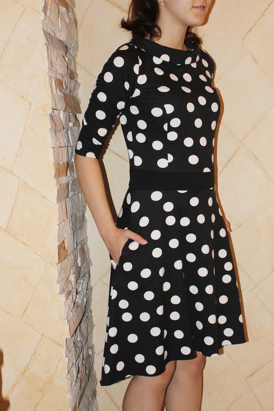 Красивое платье от Dioni. Очень мягкое, теплое и приятное к телу. Модный актуальный принт в белый крупный горох. Верх - прилегающий по телу, низ - расширенная к низу асимметричная юбка с рабочими кармашками в боковых швах. Очень красивая горловина лодочкой с отложным воротником. Рукав - 3/4. Состав ткани: Хлопок 35%, Вискоза 35%, Полиэстер 30%. Благодаря такому составу ткань не мнется в нОске. Сшито из качественного трикотажа, мягкого, средней плотности, очень приятного к телу и в то же время прочного и эластичного. Очень хорошо садится на любую фигуру, выглядит изысканно и дорого. Уход : машинная стирка. Практически не мнется, не требует утюжки. Состояние - новое. Без нюансов. Со всеми бирками. Причина продажи - пролет с размером. Плохо, когда хорошая вещь висит в шкафу. Потому и цена низкая, никаких подводных камней и подвохов! Это именно то платье, про которое можно сказать - сшито с любовью))) Размер М (46 укр): подходит на обхват груди — 92 +/-2 см, обхват талии — 74 +/-2 см, обхват бедер — 100 +/-2 см. На манекене сидит по размеру. На фото - рост девушки 170 см, параметры 85-63-93, платье слегка велико. Замеры манекена: 92-73-98 (стандартный 46-й), на манекене оно сидит комфортно. Замеры в нерастянутом разложенном виде (ткань мягкая и хорошо тянется): Длина по середине спинки - 97 см, по переду - 87 см, Ширина между крайними точками плеч - 35,5 см, Ширина между нижними точками проймы (подмышки) - 40,5 см, Полуобхват по талии - 36 см, Длина рукава - 38 см, по нижнему шву - 26 см, Полуобхват по широкой части рукава - 14 см, по низу рукава - 11 см. В зависимости от сантиметровой ленты замеры могут отличаться до 1-2 см на длинных замерах. Все дополнительные замеры или фото, в том числе с сантиметровой лентой, - без проблем, спрашивайте, отвечу на все вопросы) Смотрите другие мои объявления. Все, что я выставляю на продажу - это новые или в отличном состоянии, пару раз надетые вещи.