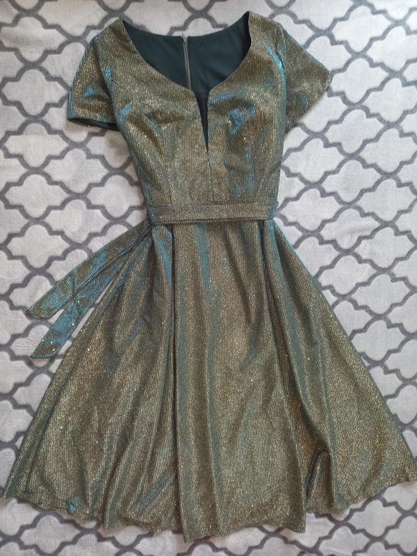 Надзвичайно гарна сяюча сукня для особливої події. Тканина всіяна золотими блискітками. Однаково ефектна як при денному світлі, так і при штучному. Глибоке декольте прикрите сіточкою (підійде для пишних форм), Є непомітні кишеньки. Одягнула лише раз на декілька годин. Жодних дефектів!