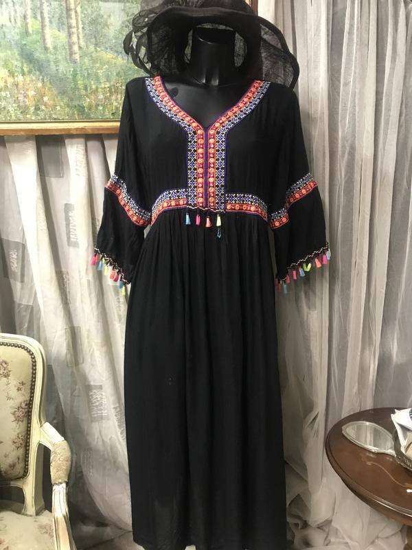 Платье в этно-стиле .резинка под грудью, рукав до локтя, на подюбнике, красивый яркий декор . Состав:вискоза-100/. Размер по бирке-L. Замеры: длина -116 см, ПОГ-48 см, садится на любые бедра(засчет фасона). Очень эффектное .