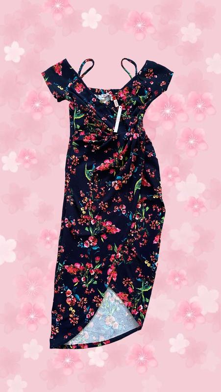 Плаття чорне в квіти. Заміри: Плечі 34-36 см ПОГ 32-35 см ПОТ 30-32 см ПОСтегон~ 40 см Довжина найдовшої сторони ~ 107 см ЗВЕРНІТЬ УВАГУ, в тканині присутній еластан, плаття трохи тягнеться та лягає ідеально по фігурі. Одяг, після отримання на поштою, поверненню не підлягає.