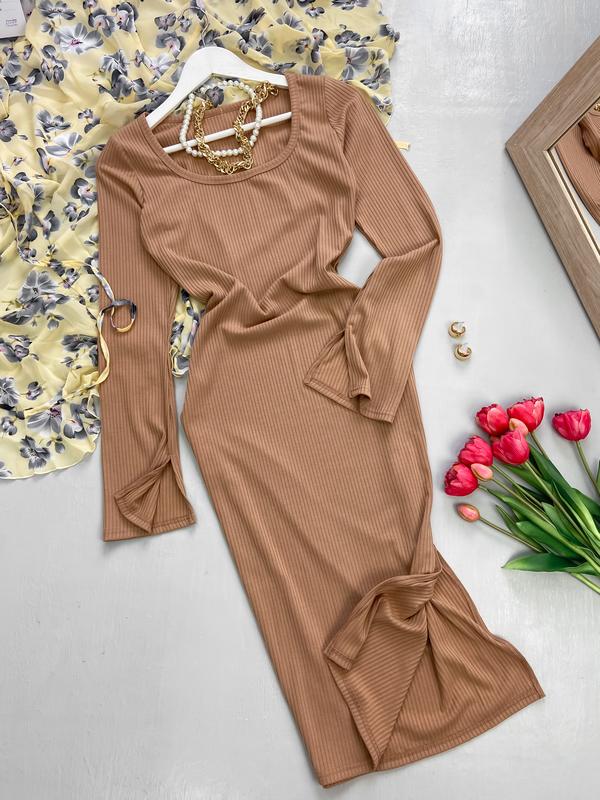 Бежевое платье миди в рубчик
