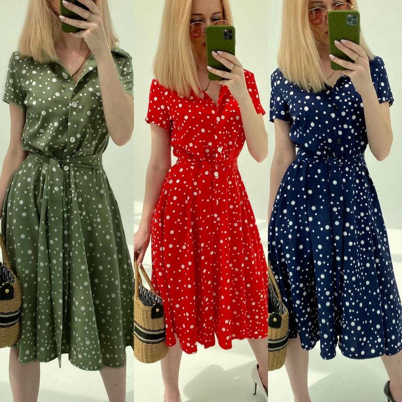 Добавлены новые цвета ! ХИТ ПРОДАЖ ! Платье в горошек Мод 501 Фото в живую! Ткань турецкий софт Размеры 42-44; 46-48; 50-52 Воротник стойка Цвета чёрный , темно синий , Бордо , красный , оливка По бокам карманы Пояс тканевый идёт в комплекте Платье на пуговичках -8 пуговиц Очень хорошее качество