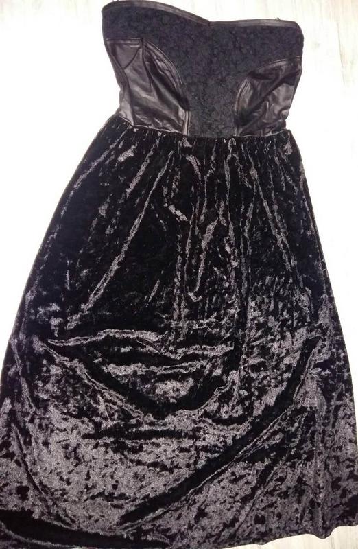 Бархат — один из самых роскошных и благородных материалов. Одежда из бархата сейчас на пике популярности. Платье без бретель с элементами кожи, выгодно подчеркнет талию и создаст вечерний образ. Размер М