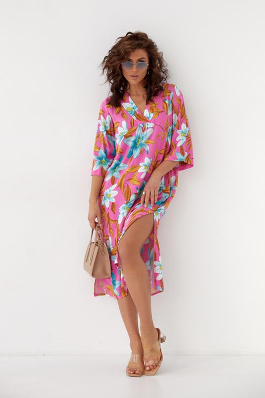 Это платье для девушек, которые обожают свободные наряды, цветочный принты и оригинальный крой. Если вы часто носите вещи oversize или любите простой стиль в одежде, обратите внимание на модное женское платье длены миди с распорками в боковых швах. Эго главным акцентом есть цветочный принт, который привлечет восхищающие взгляды окружающих. Платье пошито из качественного хлопкового полотна. Свободный фасон подойдет модницам с любым типом фигуры. Глубокий вырез V-формы открывает шею, а свободные рукава, расставляет правильные акценты. Никаких дополнительных аксессуаров такое платье не требует – нужно только открытые туфли или обувь на плоской подошве на каждый день.