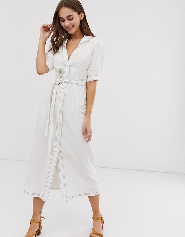Платье смотрится очень интересно, стильно, приталеное и отделано черной строчкой.Сток без бумажных бирок. Длина 123см. Пог 43см., тянется. Пот 40см. Поб 50-52см.