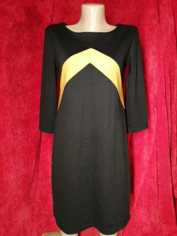 Чорне плаття з жовтою вставкою спереду і ззаду. Рукав 3/4. Досить щільне. Заміри : довжина виробу по спинці 87 см, плечі 39 см, напівобхват грудей 44 см, 48 см, низ виробу 51.5 см, довжина рукава 43 см, внутрішній шов 31.5 див. Одягалось може 2 рази.
