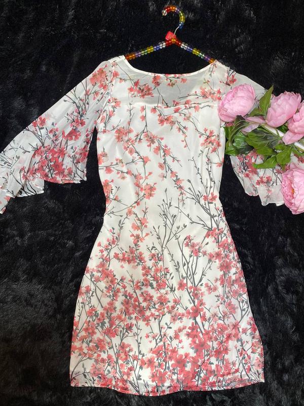 Брендове плаття з рукавами накидками,дуже гарно дивиться в живу.З гарним принтом,сакура.На ремені замазане,можливо від ремінця сумки,на фото показано.Заміри запитуйте перед покупкою.