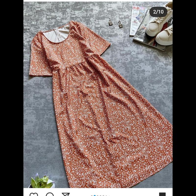 дуже гарна карамельна сукня міді в квітковий принт вільного крою. розмір М довжина 113 пог 50 в талії та стегнах вільно,ззаду на спині замочок