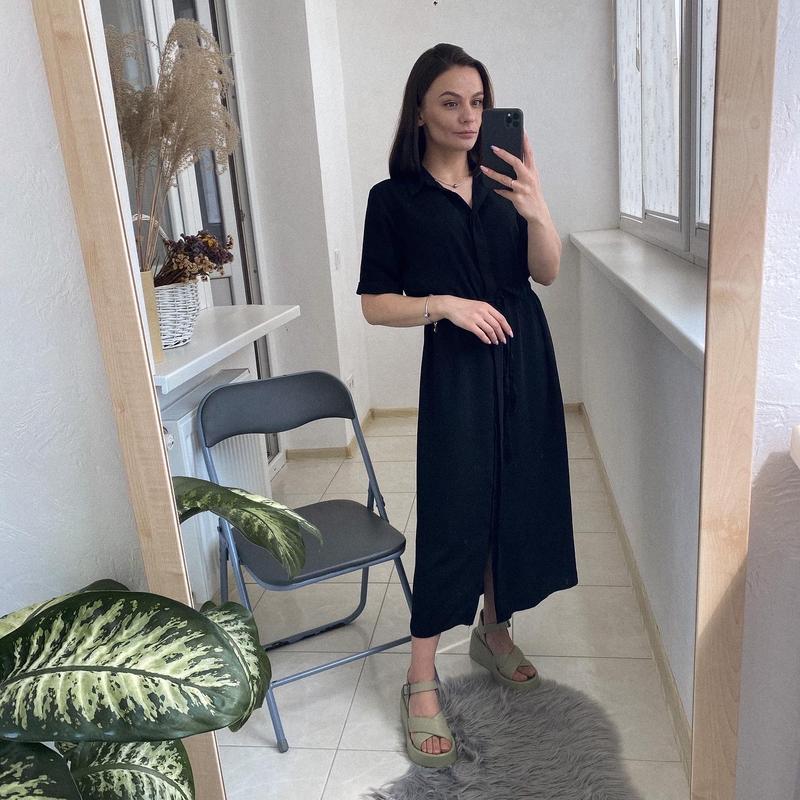🔗 Чорна сукня міді з коротким рукавом, на ґудзиках по всій довжині, з вшитою шнурівкою на талії завдяки якій можна корегувати під себе, вільного фасону Розмір s, на m теж підійде Стан нової Заміри: Довжина 118 Пог 48 Плечі 40 Рукав від плеча 24